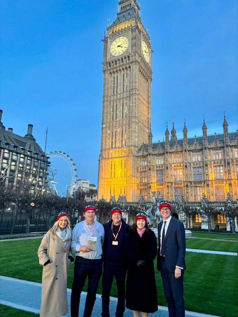 The East Cheshire Hospice Christmas tree collection reaches Westminster. From left, Tatton MP Esther McVey, Richard Raymond, Pete Chapman, Congleton MP Sarah Russell and Macclesfield MP Tim Roca, all sporting their tree hats.