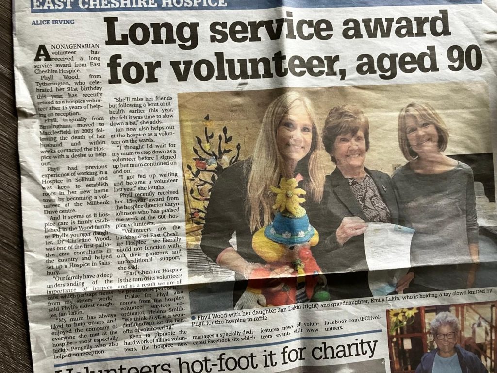 The newspaper cutting of Phyll Wood’s long service award.
