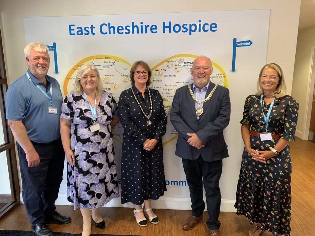 Mayor and Mayoress Jon and Helen Weston with (from left) Will Spinks, ex Chair of East Cheshire Hospice trustees, Chief Executive Karyn Johnston, and Juliette White, Chair of trustees.