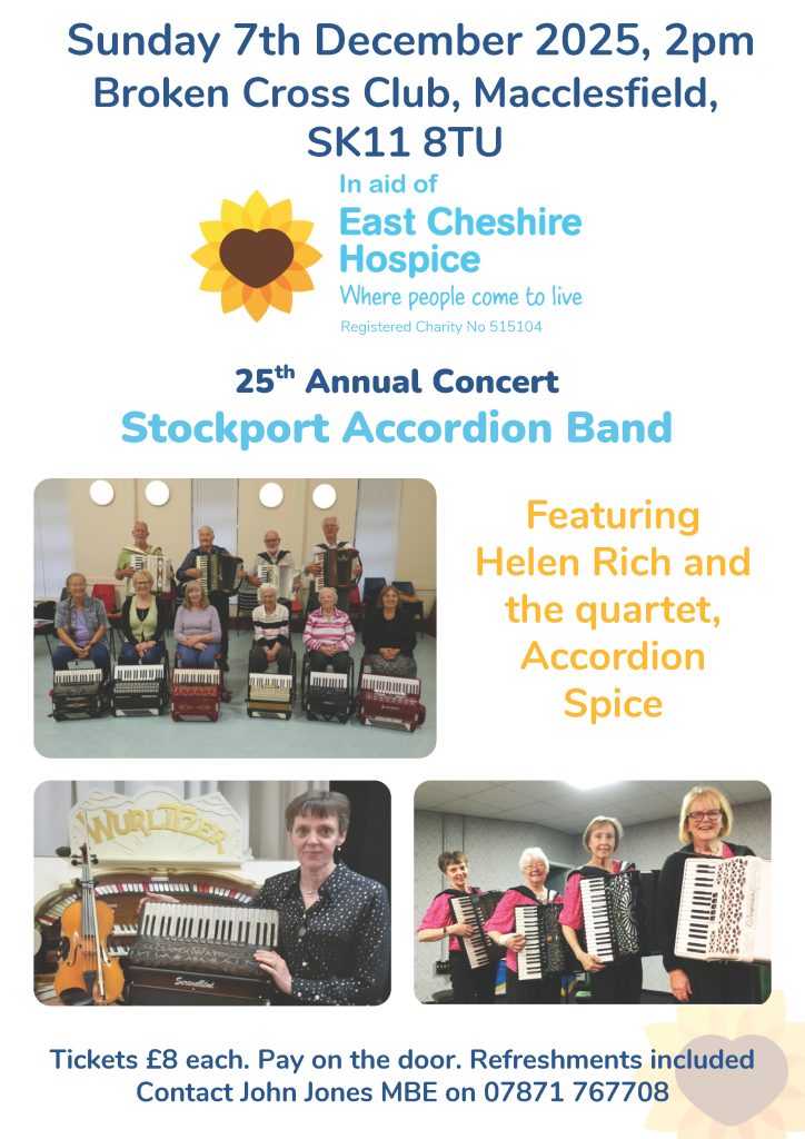 Join Stockport Accordion band on Sunday 7th December at the Broken Cross Club, Macclesfield, Cheshire, SK11 8TU form 2pm in aid of East Cheshire Hospice.