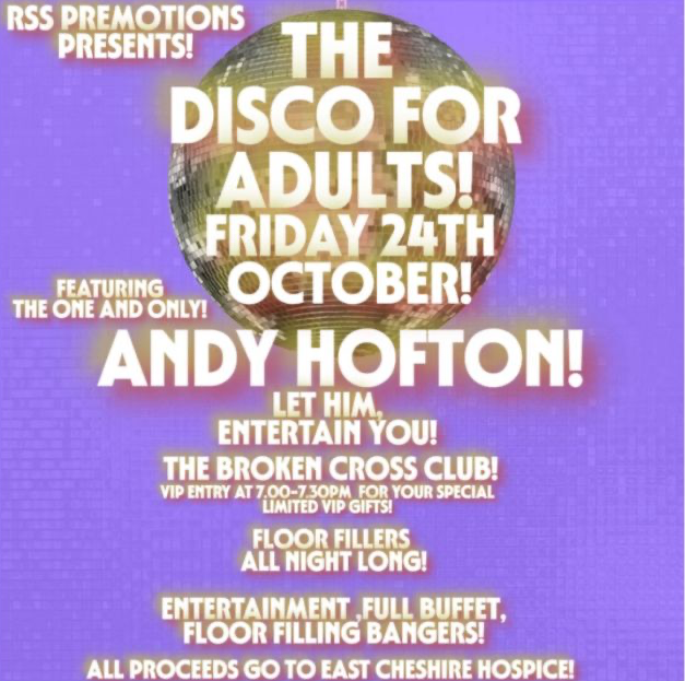 Entertainment, full buffet, floor filling bangers. All proceeds go to East Cheshire Hospice.